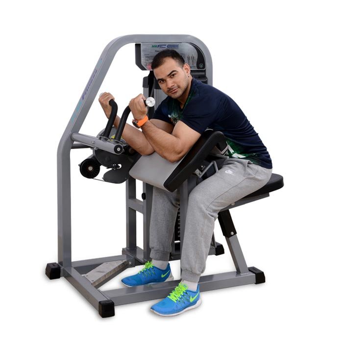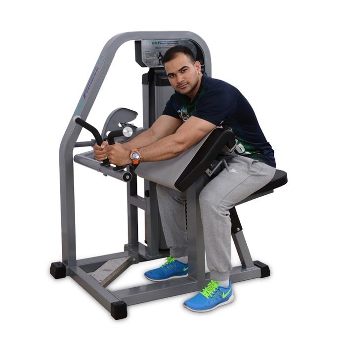 The user can perform biceps as well as Hammer triceps exercise in one machine with a counter balanced single lever adjustment. Arms Pad is angled and also adjustable with a unique locking system for stability and limits unwanted shoulder movement during exercise. Angled easy seat adjustment. Optimized pivotal locations create a bio-mechanically correct range of motion. Angled handle grips ensure optimal wrist position. Drive belt. Weight Stack 98kg with 3kg increment.