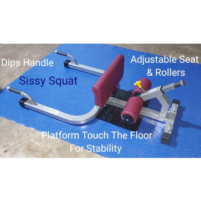 Classic design of the sissy squat bench with an open back allows users to target various muscle groups like quadriceps muscles, with secondary involvement of the gluts and calves and major core muscles. Special handles to perform dips and hooks for fixing rubber bands to increase intensity. Feet on ground level and Using the angled roller helps provide stability and support during the movement, allowing you to focus on engaging the quadriceps muscles.